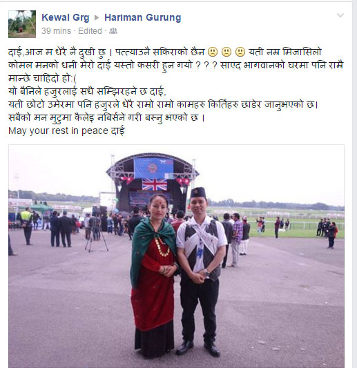 Photo journalist Hariman Gurung was found dead in UK. Gurung used to work at Everest Times online magazine. After watching Nepalese feature film “Wada Number-6” he was out of contact. Family has reported to police on Sunday about his missing. Gurung was photo journalist by profession but he used to write and sing songs. Music album “Layeko Maya” written by him was launched few month back.